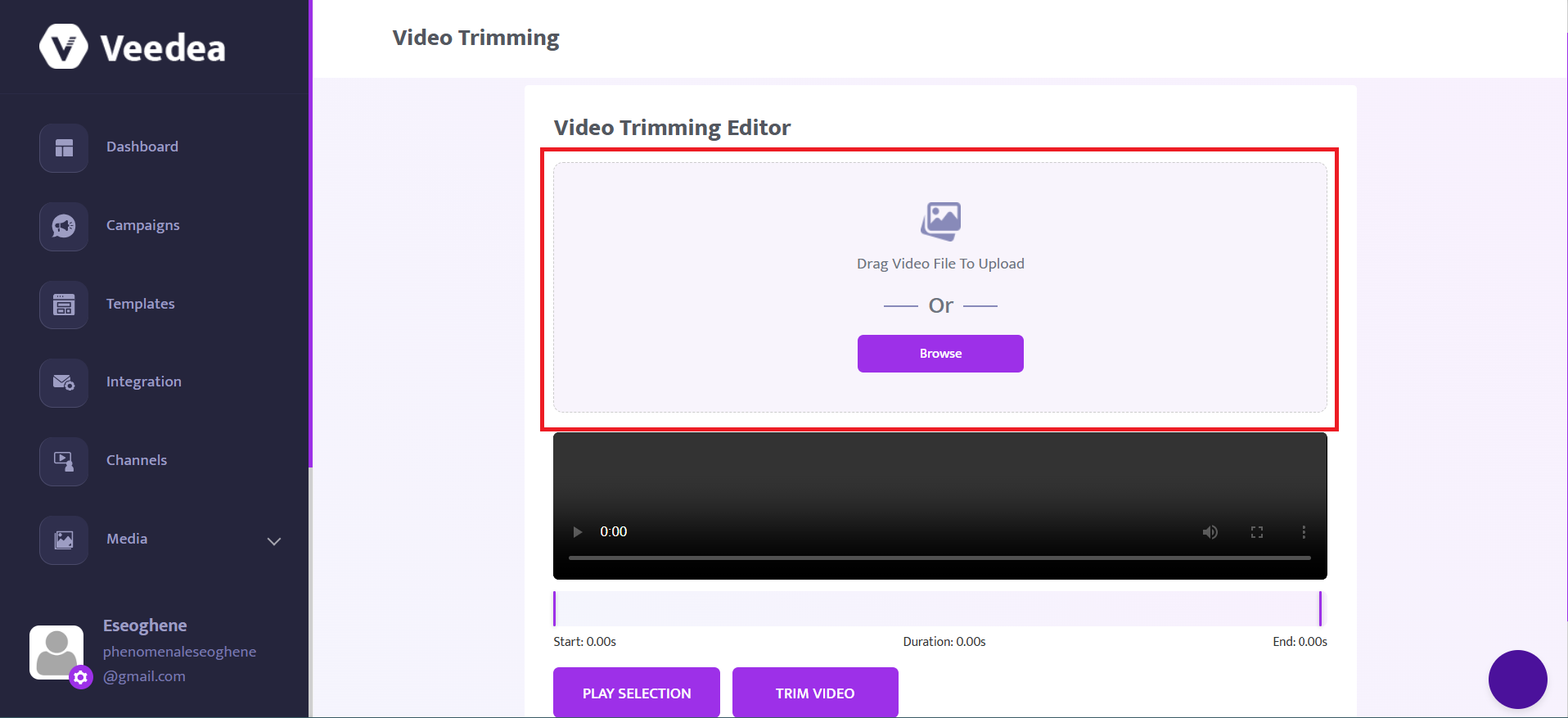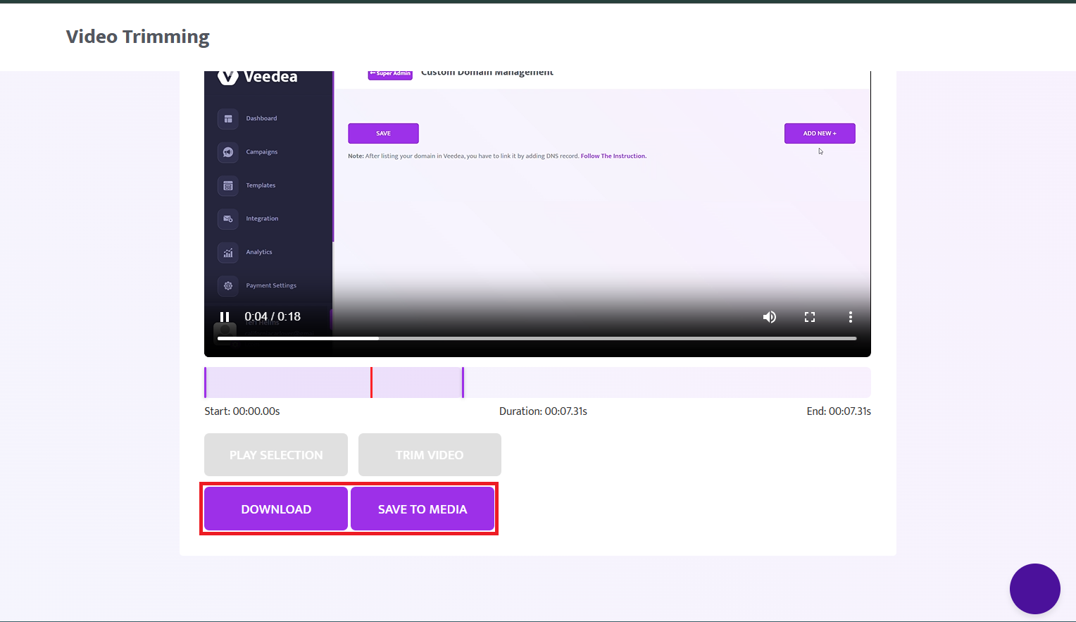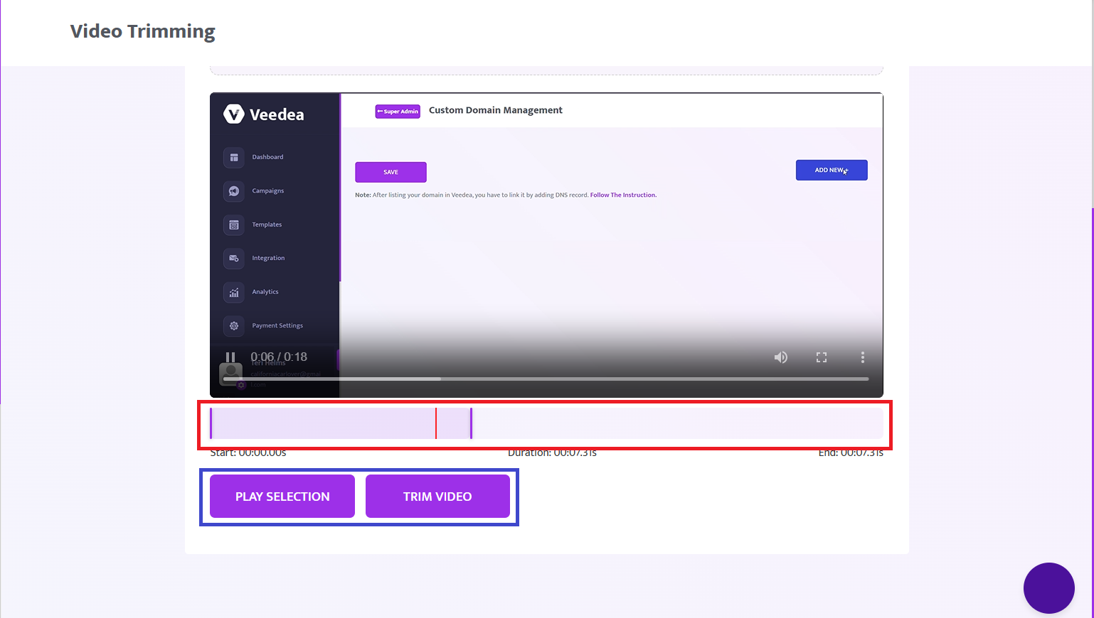 Move the purple bars to set the part of the video you want. Click Play Selection to preview it, then click Trim Video to finalize the cut.